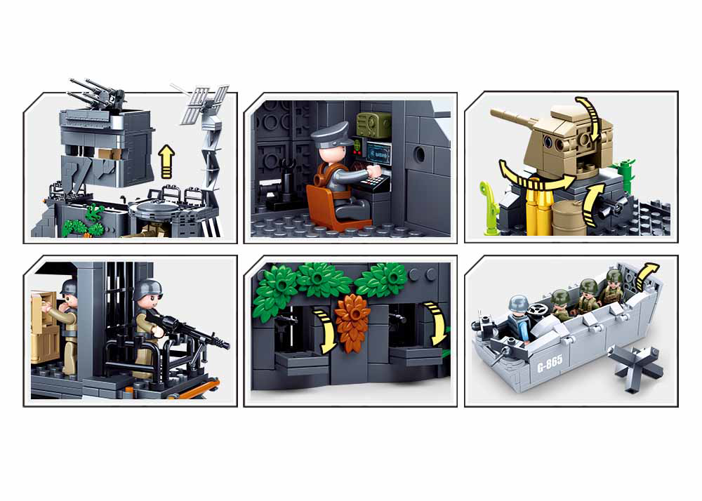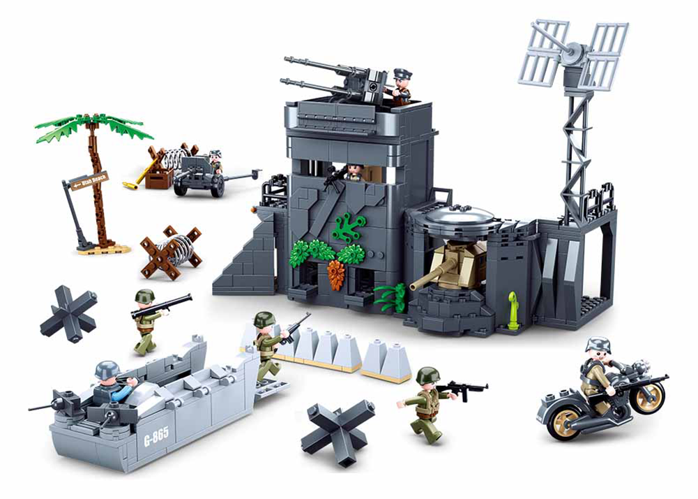 The Sluban WW2 Atlantic Wall D-Day Set has it all ! The D-Day set has a Large "Atlantic Wall" Building, With a small Command centre, Radar Installation, Coastal Canon, AA Anti-Aircraft Guns, and German Field Gun.